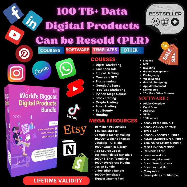 PLR Digital Products Bundle to Sell Online. Digital Downloads for Reselling or Personal Use. 100TB Data to Sell on Shopify.